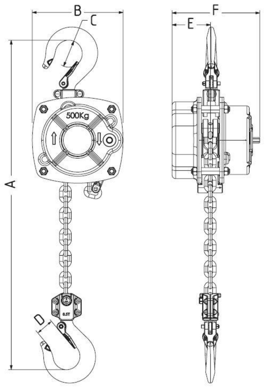 | Artikelcode | Fabrikantcode | Werklast | Ketting Ø | Max. toerental | Hijssnelheid | Gewicht | A | C | D | F |